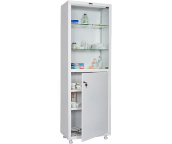 предназначены для хранения медикаментов, инструментов,больничных документов, карточек пациентов в медицинских учреждениях и организациях  изготовлены из стали, толщина корпуса 0,6мм, толщина двери 0,7мм, толщина стекла двери 4мм, толщина стекла полки 5мм  хромированные магнитные защелки, фиксируют дверь в закрытом состоянии (устанавливаются на стеклянные двери)  комплектуются ключевыми замками Практик (1000 комбинаций), (замок устанавливается только на металлические двери)  максимальная нагрузка на металлическую полку - 30 кг, на стеклянную полку – 10 кг  поставляются в разобранном виде, в комплект поставки входят четыре регулируемые опоры (высота-100 мм, диапазон регулировки: 100-125 мм)  опции: установка трейзера.  Модель трейзера MD 1 1650  (только в нижнее отделение)