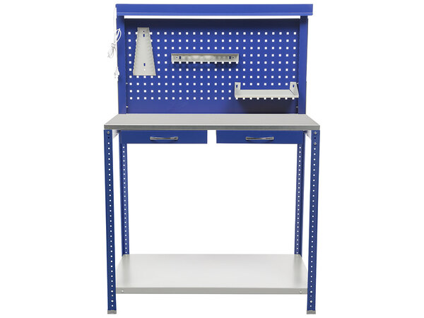 Состоит из: Столешница изготовлена из МДФ 16 мм с накладкой из оцинкованного листа металла толщиной 1.2 мм. Нагрузка на столешницу 100 кг. Полка MS Standart 100x50 – до 100 кг нагрузка, шаг перестановки 25 мм Четыре стойки MS Hard – сталь 1,5 мм, сечение 40х40 мм Два ящика Garage, нагрузка до 5 кг на ящик Экран с перфорацией 10х10 мм, шаг 38 мм, сталь 0,8 мм, нагрузка до 30 кг Светодиодное освещение. Мощность 11 Вт; световой поток - 880 Лм; цветовая температура – белый 4000 К с козырьком Общая нагрузка на верстак до 300 кг Комплект из трех аксессуаров (Держатель ключей WH, Держатель инструмента TH, Полка малая SSh) Возможность установки дополнительных элементов