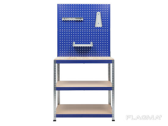 Основные преимущества: Быстрая и лёгкая сборка – 40-50 минут (1 сборщик) Весь комплект в одной коробке Возможность установки дополнительных аксессуаров Максимальная нагрузка 450 кг Состоит из: Cтолешница - фанера 21 мм, покрытая лаком. Нагрузка 100 кг Опоры изготовлены из оцинкованных стоек стеллажа SBL, профиль36х36 мм, толщиной 0,8. Garage Set 3 оснащен двумя настилами, выполненными из Z-образных балок стеллажа SBL, с настилом ХДФ толщиной 6 мм. Нагрузка 175 кг. Верстак оснащен двумя экранами выполненными из металла 0.8 мм нагрузка 30 кг. Габаритные размеры ВхШхГ: 445х892х34 мм, с перфорацией 10х10 мм, шаг 38мм,. Комплект из трех аксессуаров (Держатель ключей WH, Держатель инструмента TH, Полка малая SSh)